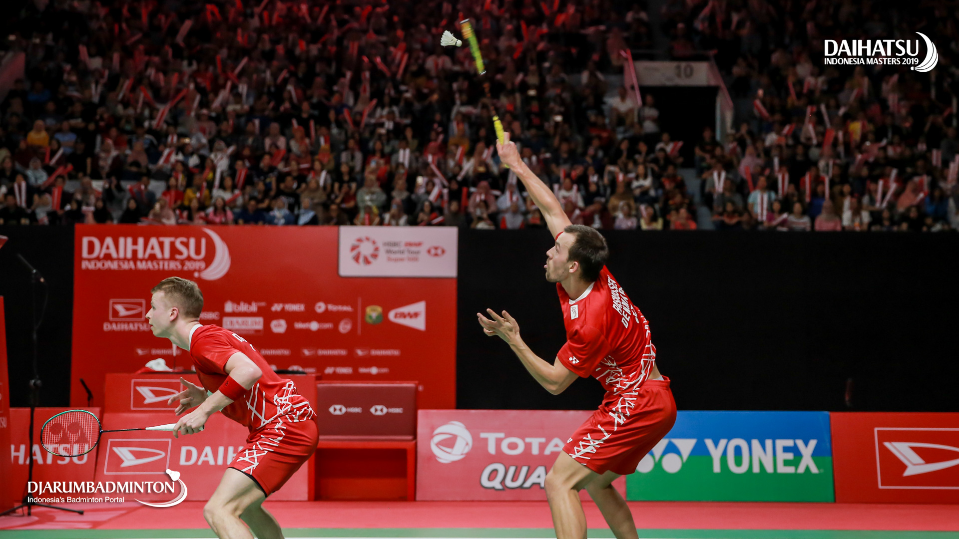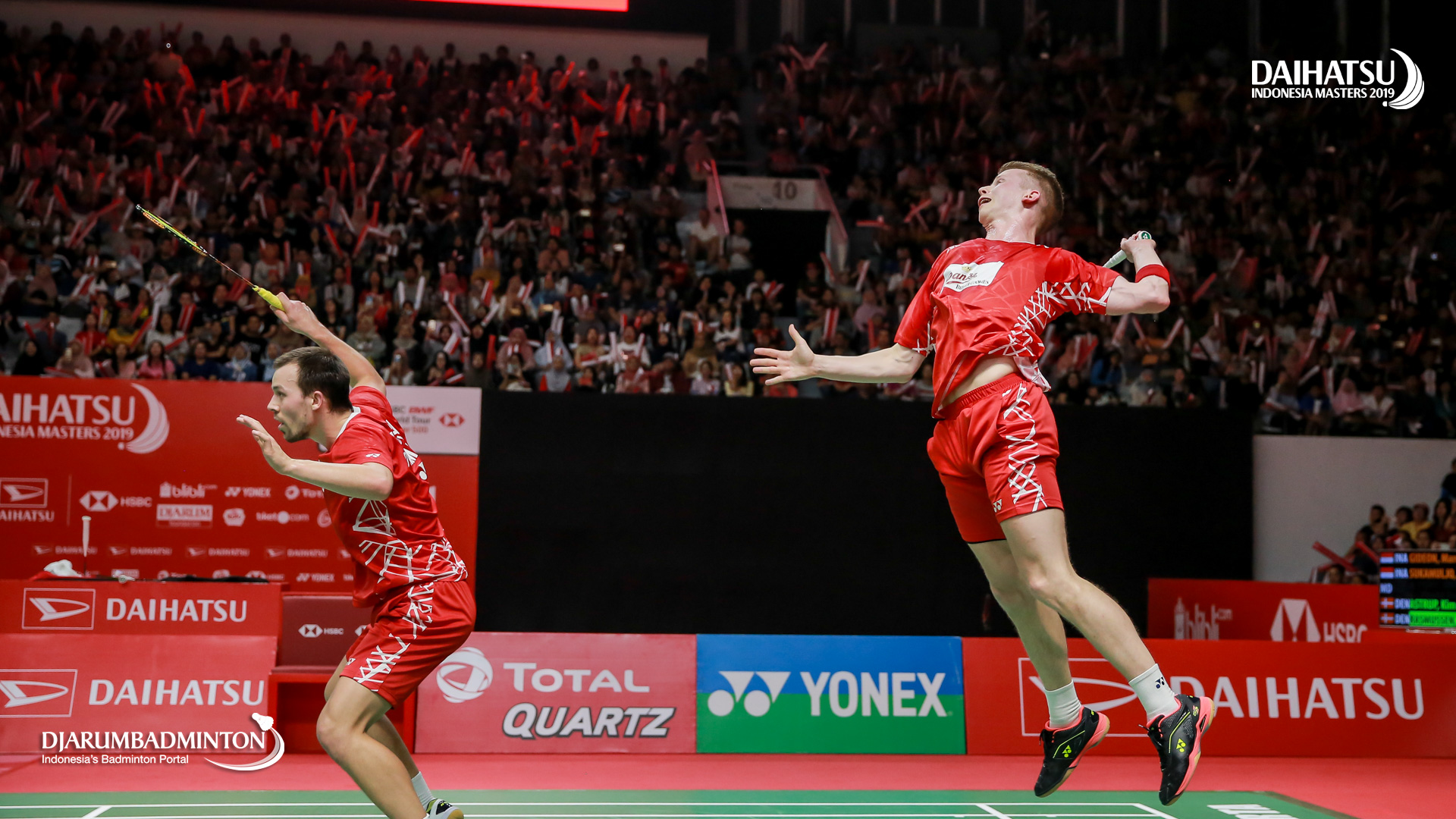 Kim ASTRUP/Anders Skaarup RASMUSSEN (Denmark) menyambar pengembalian