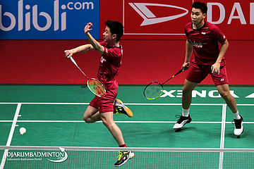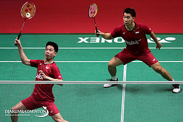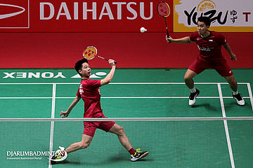 Kevin Sanjaya Sukamuljo/Marcus Fernaldi Gideon (Indonesia) Mengembalikan Shuttlecock