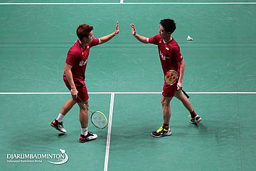Selebrasi Kevin Sanjaya Sukamuljo/Marcus Fernaldi Gideon (Indonesia)