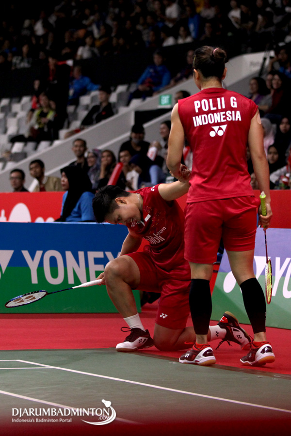 Apriyani Rahayu/Greysia Polii (Indonesia) Terjatuh Saat Menghadang Serangan