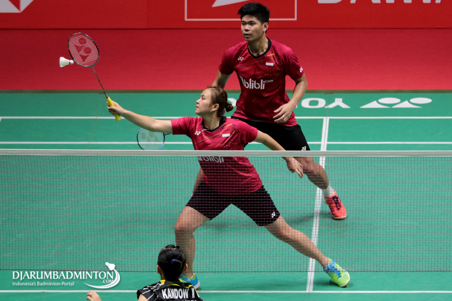 Rinov Rivaldy/Angelica Wiratama (Indonesia) Menghadang Serangan