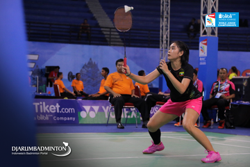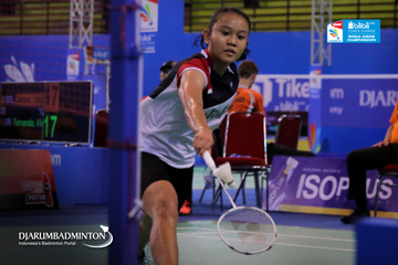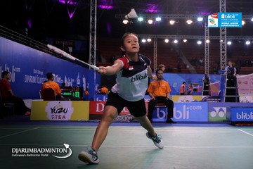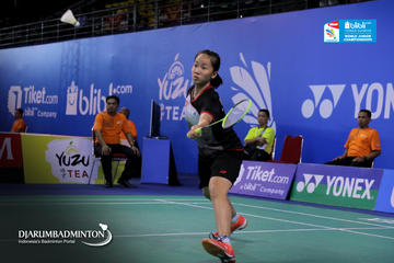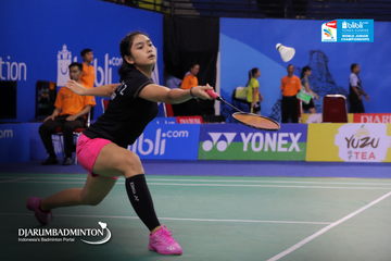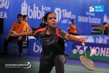 Aurum Oktaviawinata (Indonesia) Mengembalikan Shuttlecock Lawan