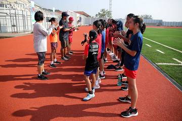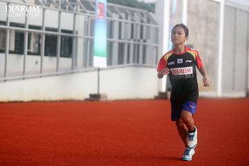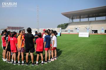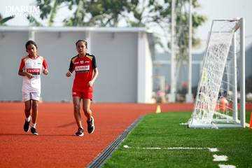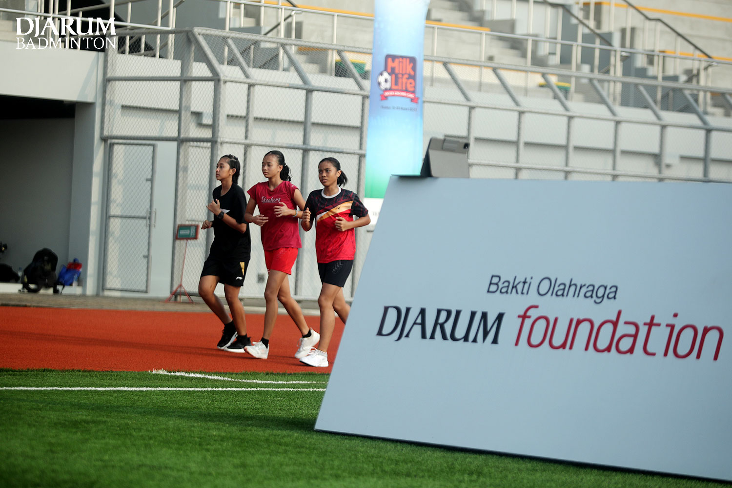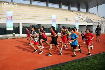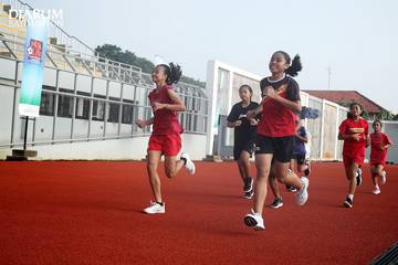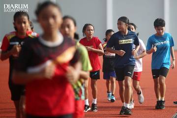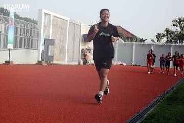 Para atlet putri PB Djarum melakukan latihan ketahanan fisik di lintasan atletik di Supersoccer Arena, Rendeng, Kudus, Jawa Tengah, Sabtu (18/3).