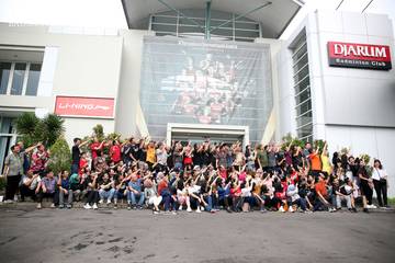 Para mantan atlet dan pelatih serta para pengurus PB Djarum berfoto bersama di depan GOR Djarum, Jati, Kudus, Jawa Tengah, Jumat (29/4). Mereka datang ke Kudus untuk merayakan hari ulang tahun ke-54 PB Djarum.