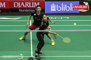 M. Robby Darwis dan Rahmadhani Hastiyanti Putri (Sangkuriang Graha Sarana PLN Bandung+PB Djarum, Kudus) berusaha mengembalikan shuttlecock