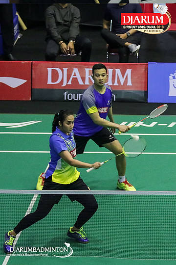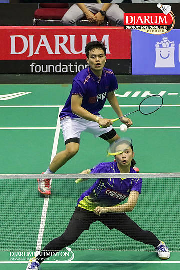 Nugroho Andi Saputro dan Tiara Rosalia Nuraidah (Halim, Jakut+Mutiara Cardinal, Bandung) mengembalikan shuttlecock