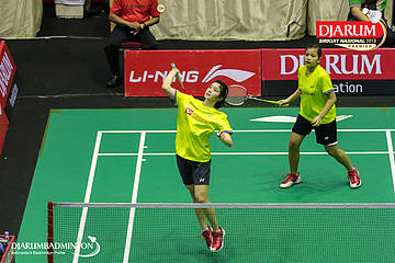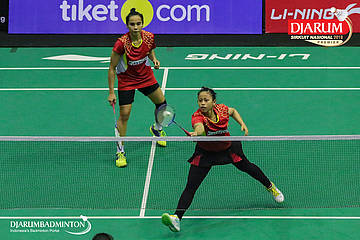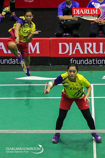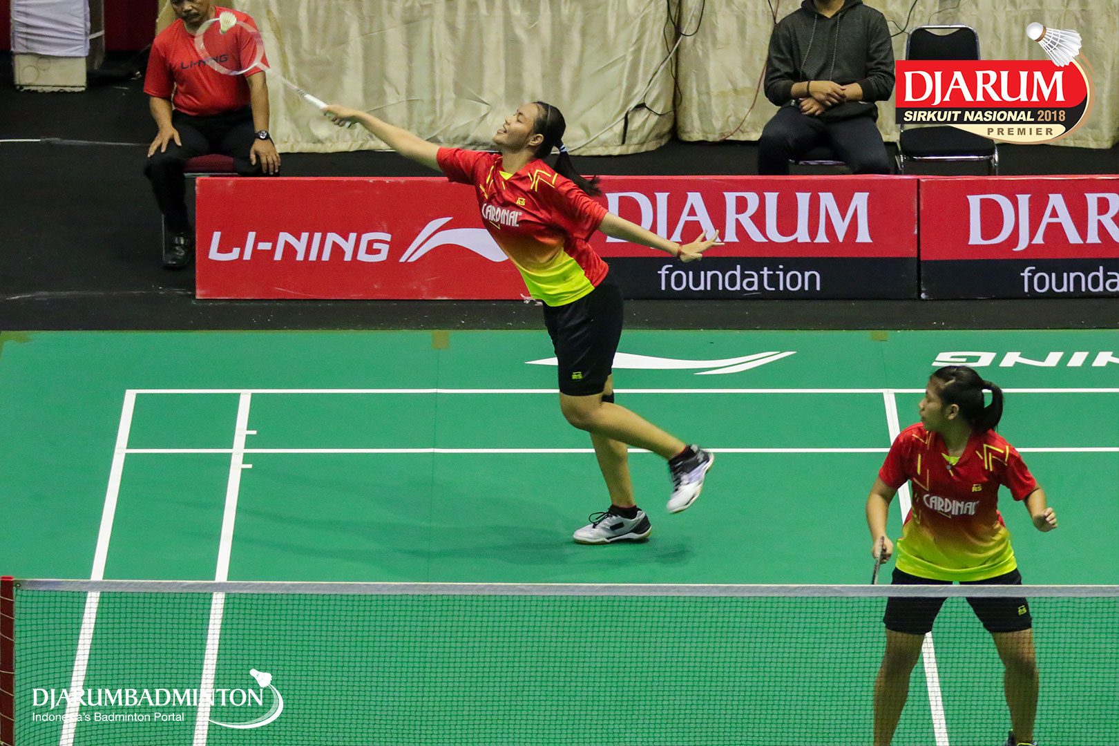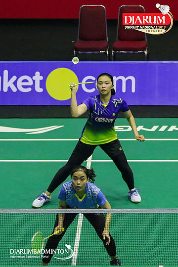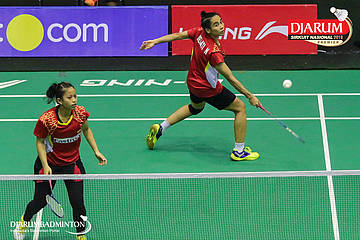 Dian Fitriani dan Nadiya Melati (Pertamina Fastron+Pertamina Fastron, Jakut) mengembalikan shuttlecock