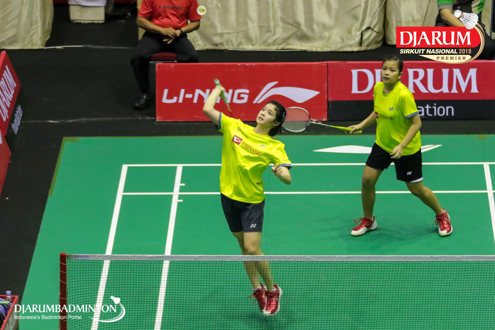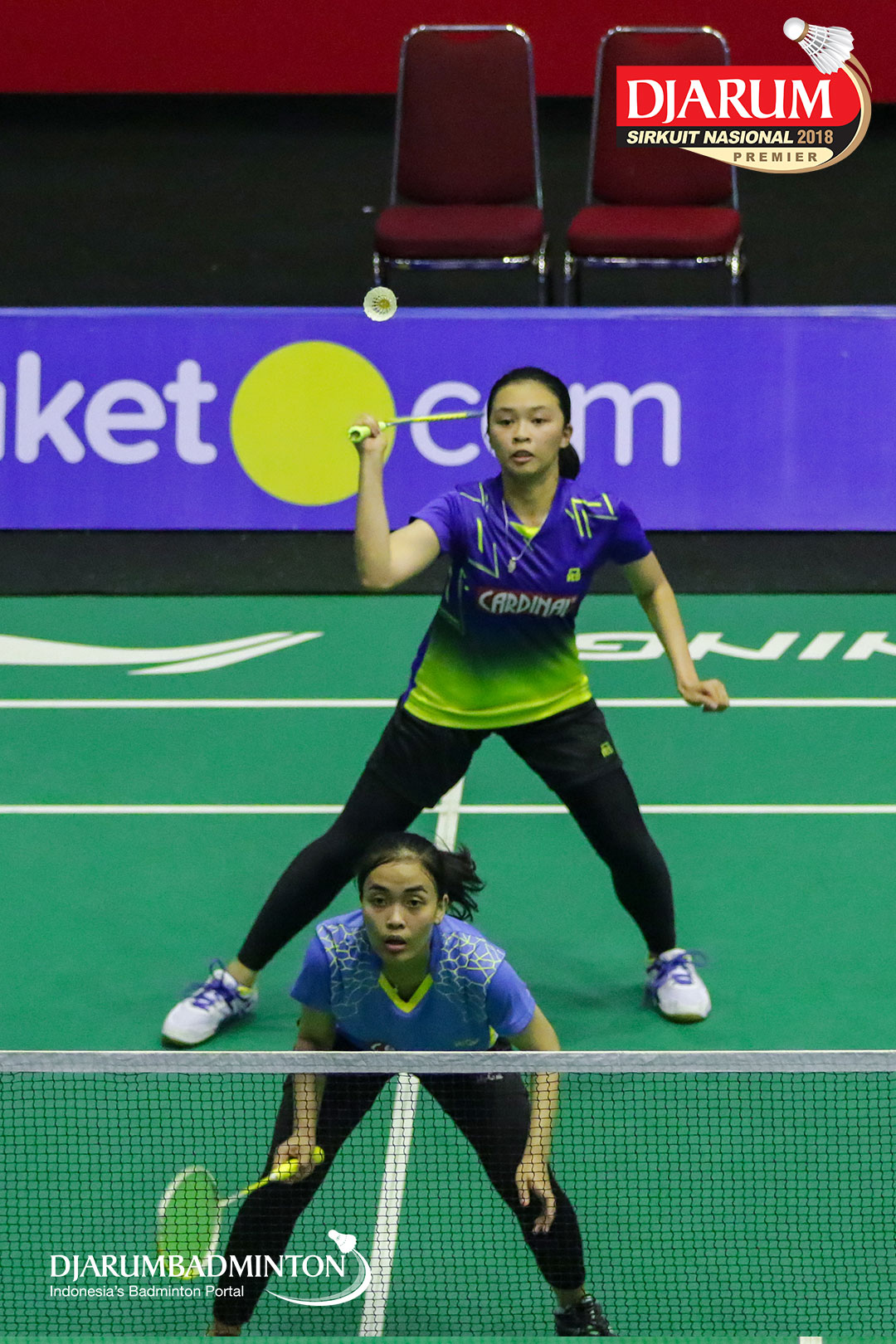 Nathalie Ivyana dan Regina Abela Rullyanda (Daihatsu Candra Wijaya) bersiap menyambut shuttlecock