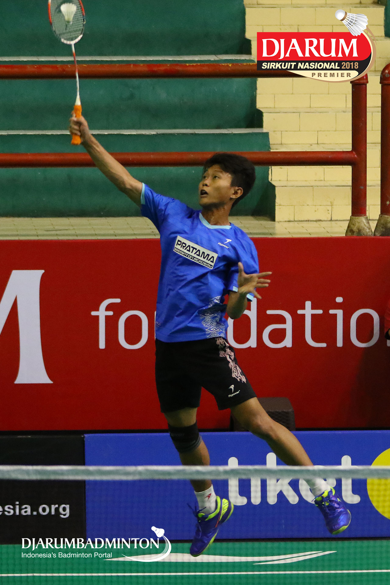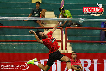 Nur Yahya Ady Velani (Pratama Badminton Academy, Sby) menyambut serangan