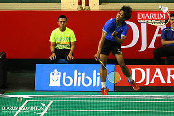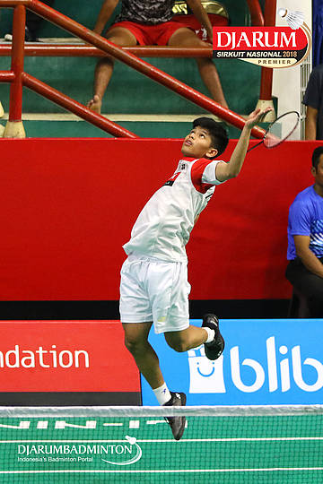Aldy Firmanda (PB Djarum, Kudus) menyambar shuttlecock