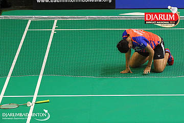 Made Deya Surya Saraswati (Exist, Jakarta) terjatuh saat berusaha menggapai pengembalian