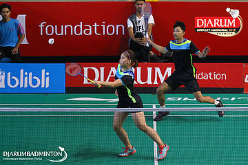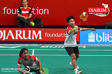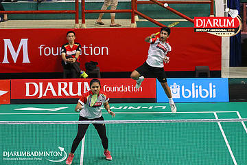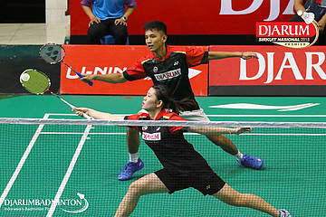 M. Lucky Andres Apriyanda/Helena Ayu Puspitasari (PB Djarum, Kudus) menyambar shuttlecock