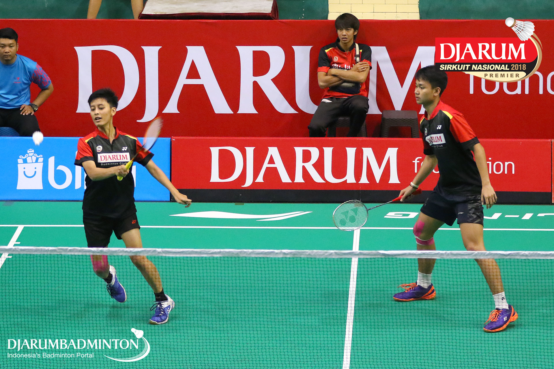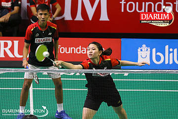 I Putu Pande Sheva Brahmantya Putra/Aldira Rizki Putri (PB Djarum, Kudus) mengembalikan shuttlecock