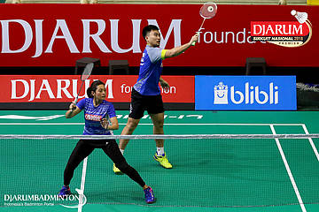 Amri Syahnawi/Pia Zebadiahbernadet (Jaya Raya Jakarta, Jakpus) menyambar shuttlecock