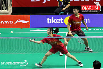 Michael Kaldrian Wiguna/Nathalie Ivyana (Daihatsu Candra Wijaya) berusaha menyambut serangan