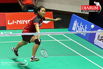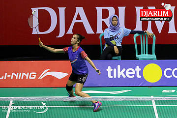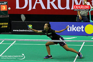 Savira Sandradewi (PB Djarum, Kudus) berusaha menyambut shuttlecock