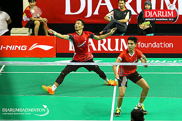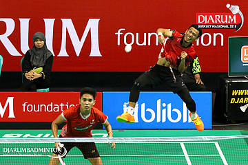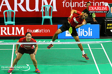 Nugroho Andi Saputro/Tiara Rosalia Nuraidah (Halim, Jakut+Mutiara Cardinal, Bandung) melepaskan serangan