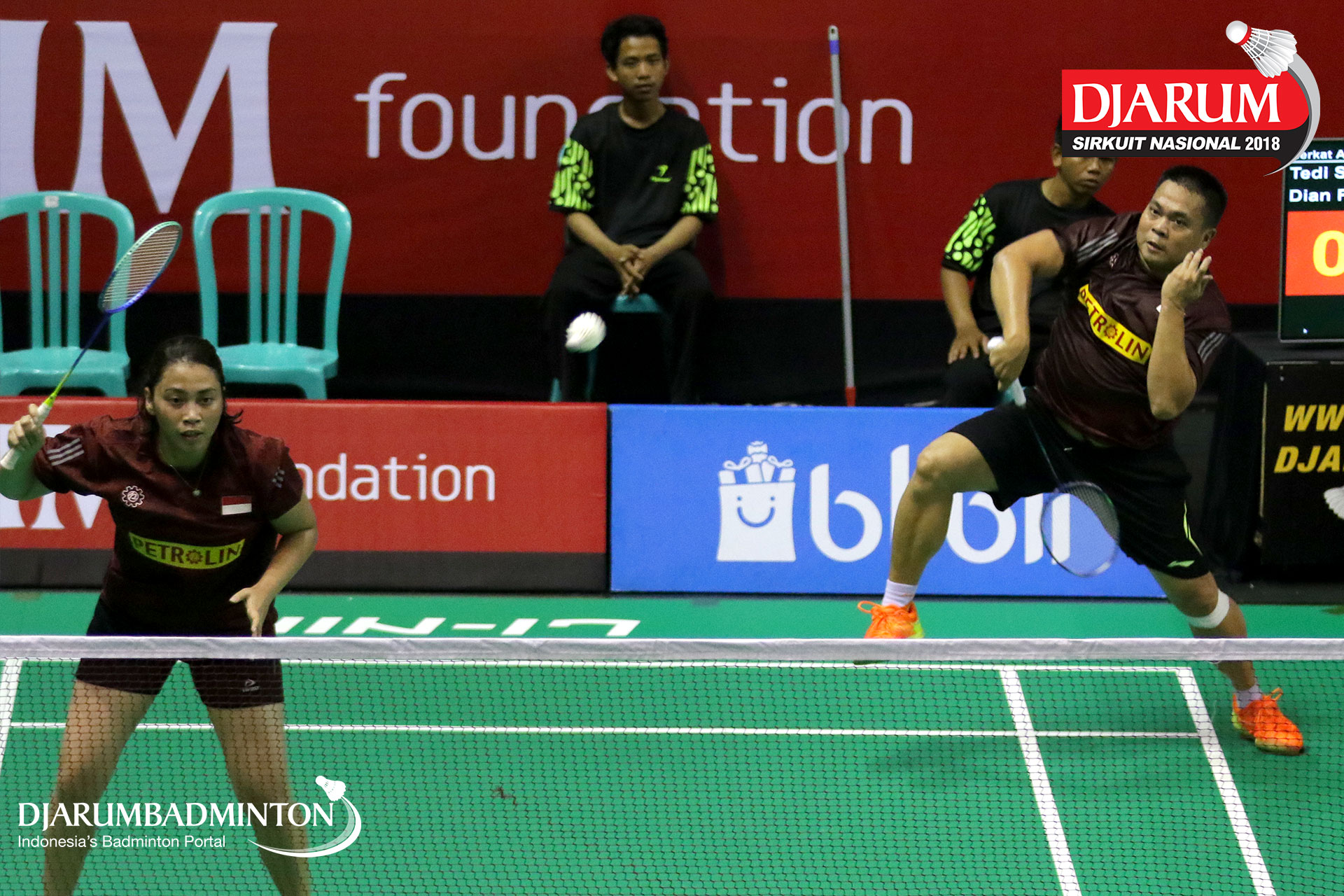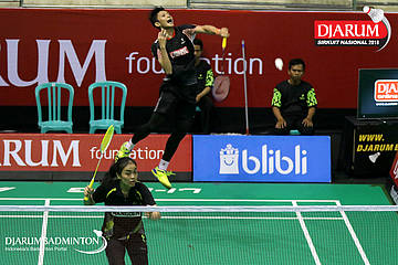 Abdul Kadir Zailani/Linda Mutiara Pertiwi (Mutiara Cardinal, Bandung+PB.SENDAWAR BADMINTON CLUB) melepaskan smash