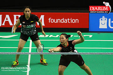 Dian Fitriani/Nadiya Melati (Pertamina Fastron, Jakut) mengembalikan shuttlecock
