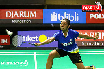 Maria Septiana Wandini Pramesti (Mutiara Cardinal, Bandung) mengembalikan shuttlecock