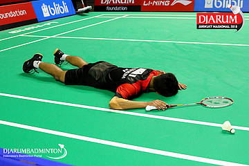 Bagas Kristianto Nugroho (PB Djarum, Kudus) terjatuh saat berusaha mengembalikan serangan