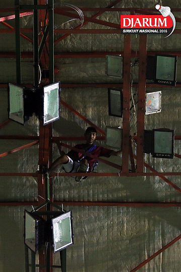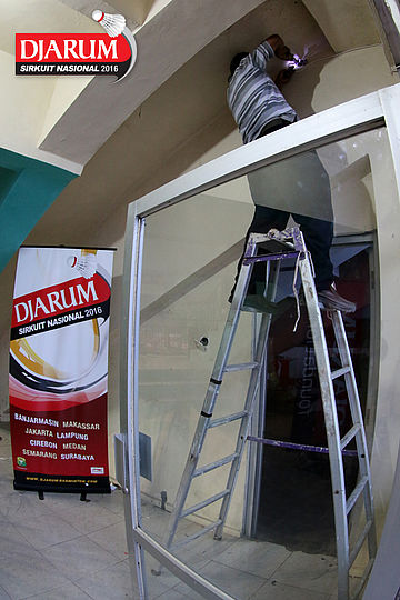 Seorang pekerja mempersiapkan dekorasi Djarum Sirkuit Nasional Li-Ning Jawa Barat Open 2016