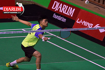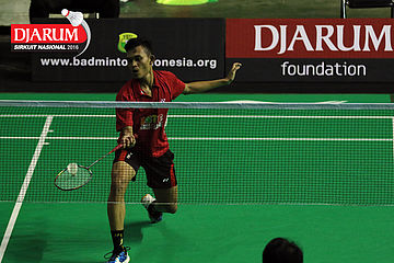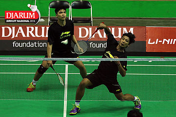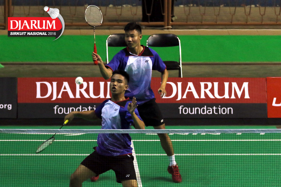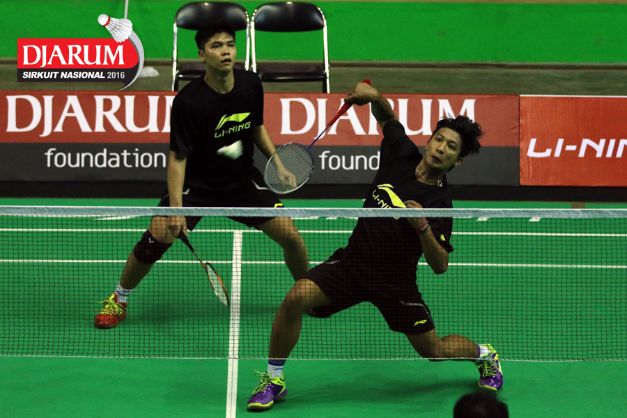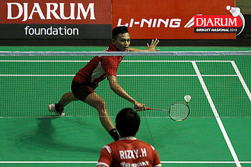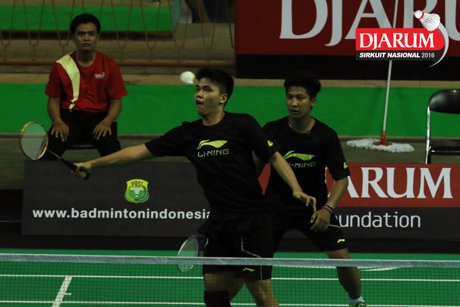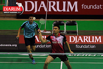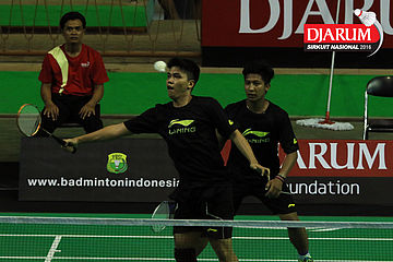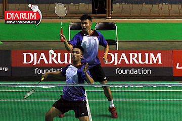 Ade Lukas/Wifqi Windarto (Djarum Kudus) mengembalikan shuttlecock