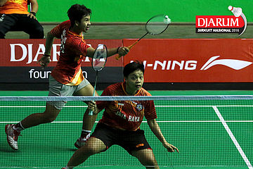 Devand Riefky/Apriani Rahayu (Jaya Raya) bersiap menyambar pengembalian tanggung