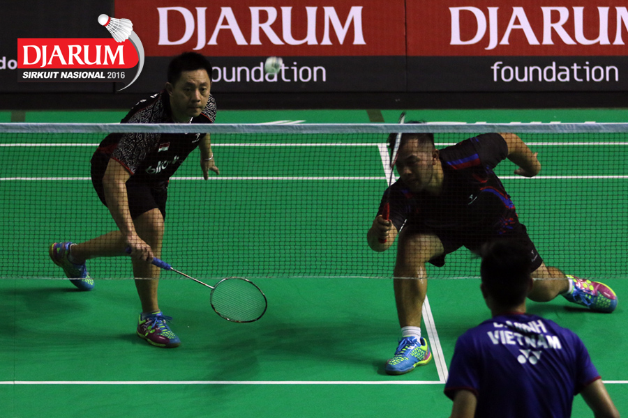 David Pohan/Sigit Sudrajat (Djarum Kudus) bersiap menghadang serangan
