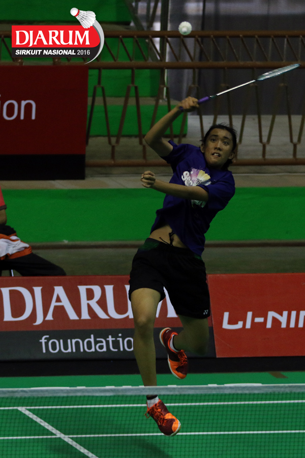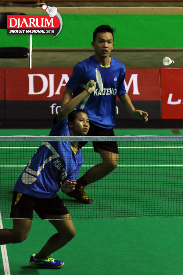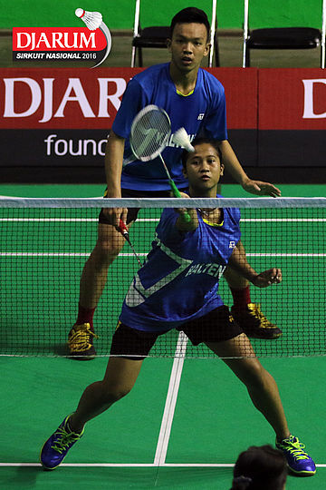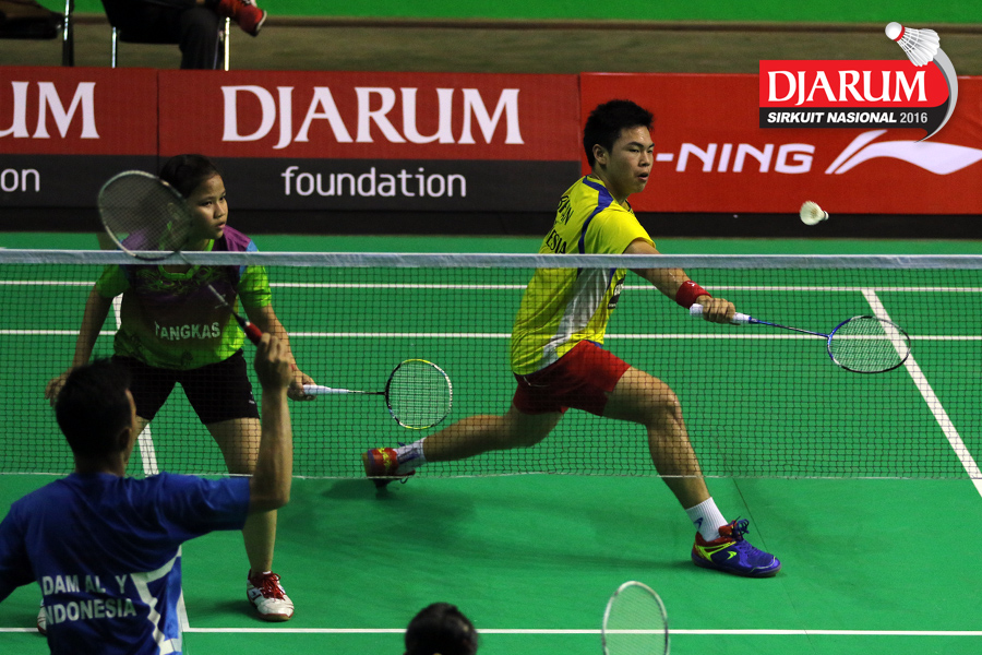 Bryan Sydney/Dea Putri (Tangkas) bersiap menyambar pengembalian tanggung