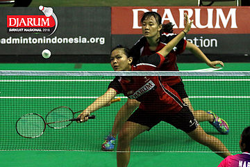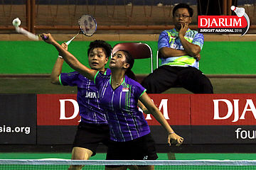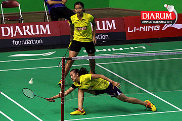 Febriana Dwipuji/Ribka Sugiarto (Djarum Kudus) menghadang serangan