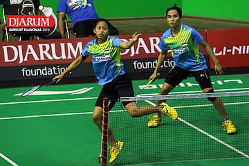 Dian Fitriani/Nadya Melati (Pertamina Fastron) mengembalikan shuttlecock