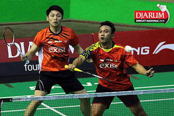 Akbar Bintang/Angger Sudrajat (Djarum Kudus) mengembalikan shuttlecock