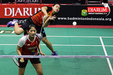 Haffiz Nur Adila/Helmi Abbu (Djarum Kudus) Mengembalikan Shuttlecock.