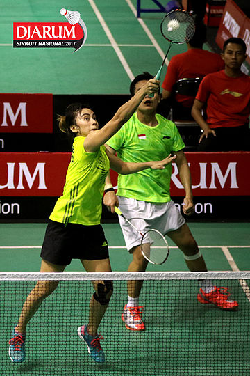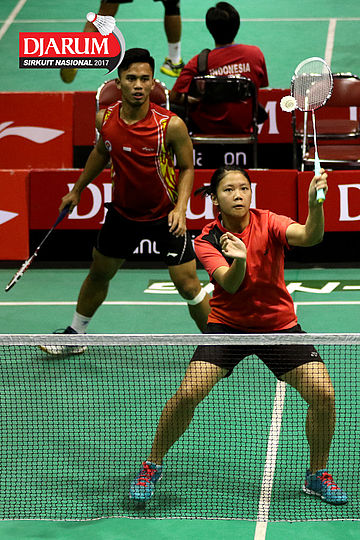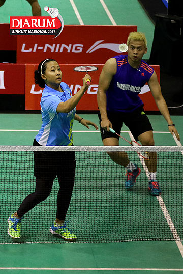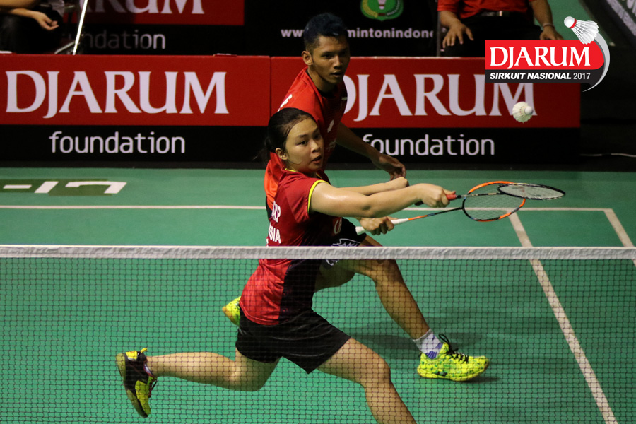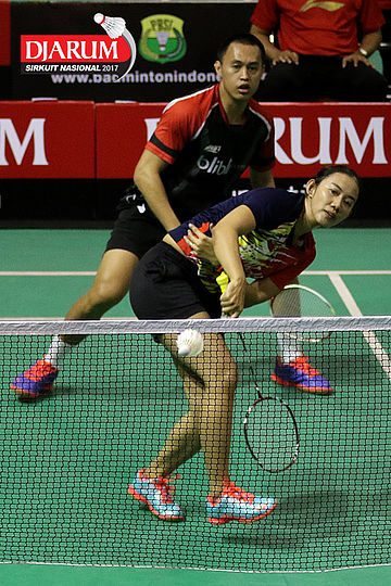 Tedi Supriadi/Devi Tika Permatasari (Djarum Kudus/Berkat Abadi) Mengembalikan Shuttlecock
