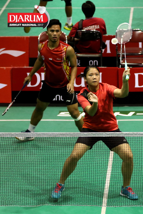Fiesal Wiranto/Annisya Widya Permatasari (Pusdiklat Telkom/Mutiara Cardinal) Mengembalikan Shuttlecock