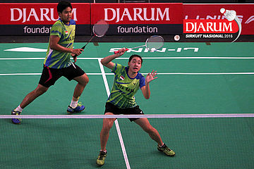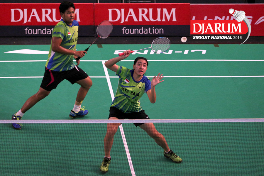 Irfan Fadhillah/Weni Anggraeni (Jaya Raya) bersiap menyambar pengembalian