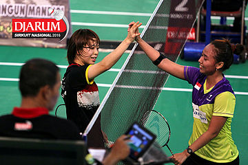 Ikumi Mine (Gifu Jepang) bersalaman dengan Ana Rovita (Pertamina Fastron) usai bertanding
