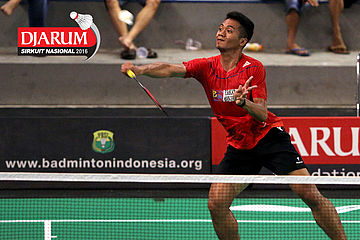 Evert Sukamta (Tangkas) mengembalikan shuttlecock