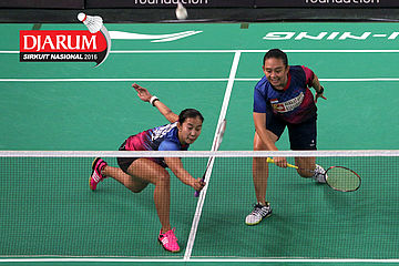 Febriana Dwipuji/Ribka Sugiarto (Djarum Kudus) menyambar pengembalian