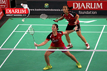 Lisa Ayu/Vanadia Prasana (Djarum Kudus) mengembalikan shuttlecock