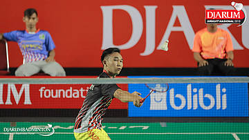 Yosua (PB Victory Bogor, Jaktim) mengembalikan shuttlecock
