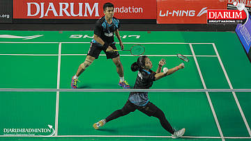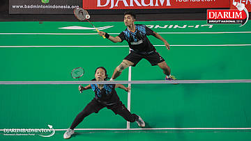 Muliadi Rizka Saputra+Trisma Arlisa Septiana (Pratama Badminton Academy, Sby) menyambut shuttlecock