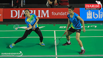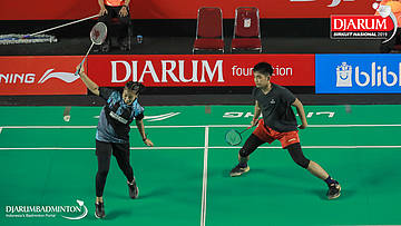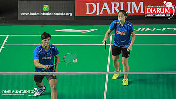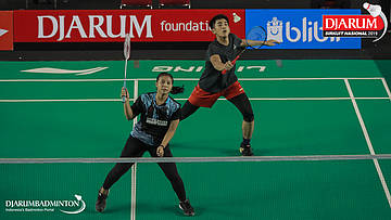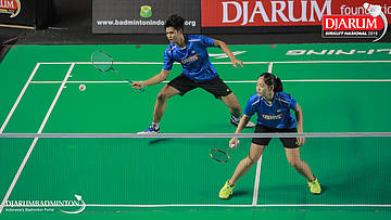Resky Wahyudi+Mutiara Lailatul Nur (Berkat Abadi, Banjar+Exist Badminton Club) bersiap menyambut shuttlecock