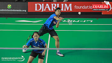 Alivia Nadifah Salma+Dina Ainun Nissa Raharja (Mutiara Cardinal, Bandung) melepaskan serangan