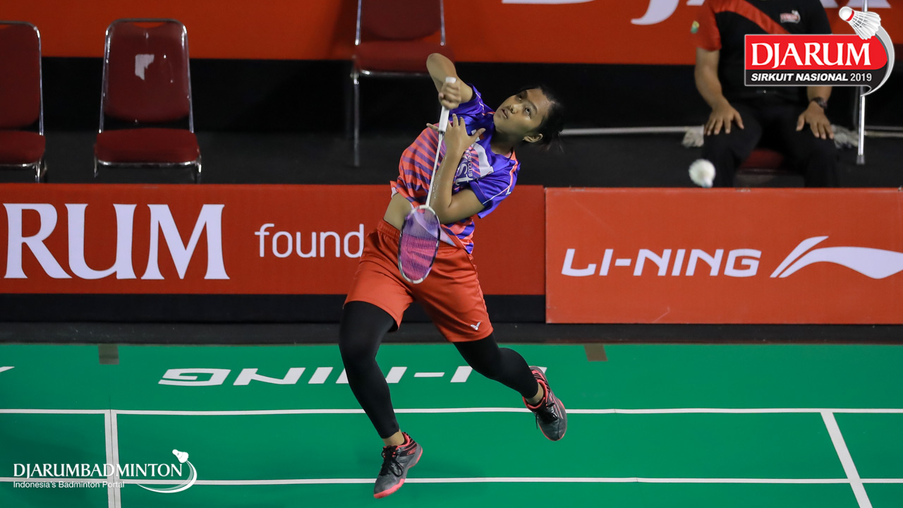 Tiara Ayuni Wulandari (Exist Badminton Club) bersiap menyambut shuttlecock