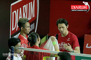 Agripina Primarahmanto Putera/Devi Tika Permatasari (Berkat Abadi, Banjar) mendapat pengarahan oleh pelatih