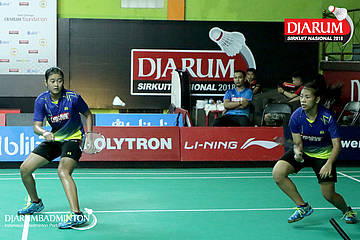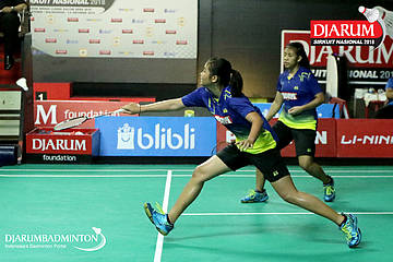 Amalia Cahaya Pratiwi/Putri Andini Wahyuningrum (Mutiara Cardinal, Bandung) bersiap menyabut shuttlecock