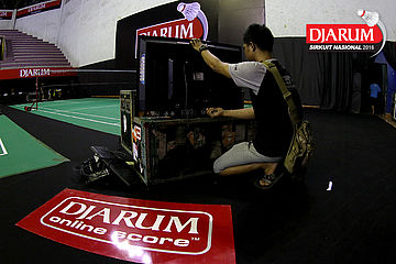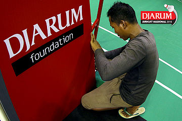 Dua pekerja sedang mempersiapkan perangkat Djarum Sirkuit Nasional Li-ning Lampung Open 2016