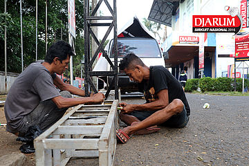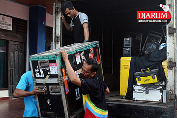 Dua pekerja mempersiapkan Dua pekerja sedang mempersiapkan perangkat Djarum Sirkuit Nasional Li-ning Lampung Open 2016